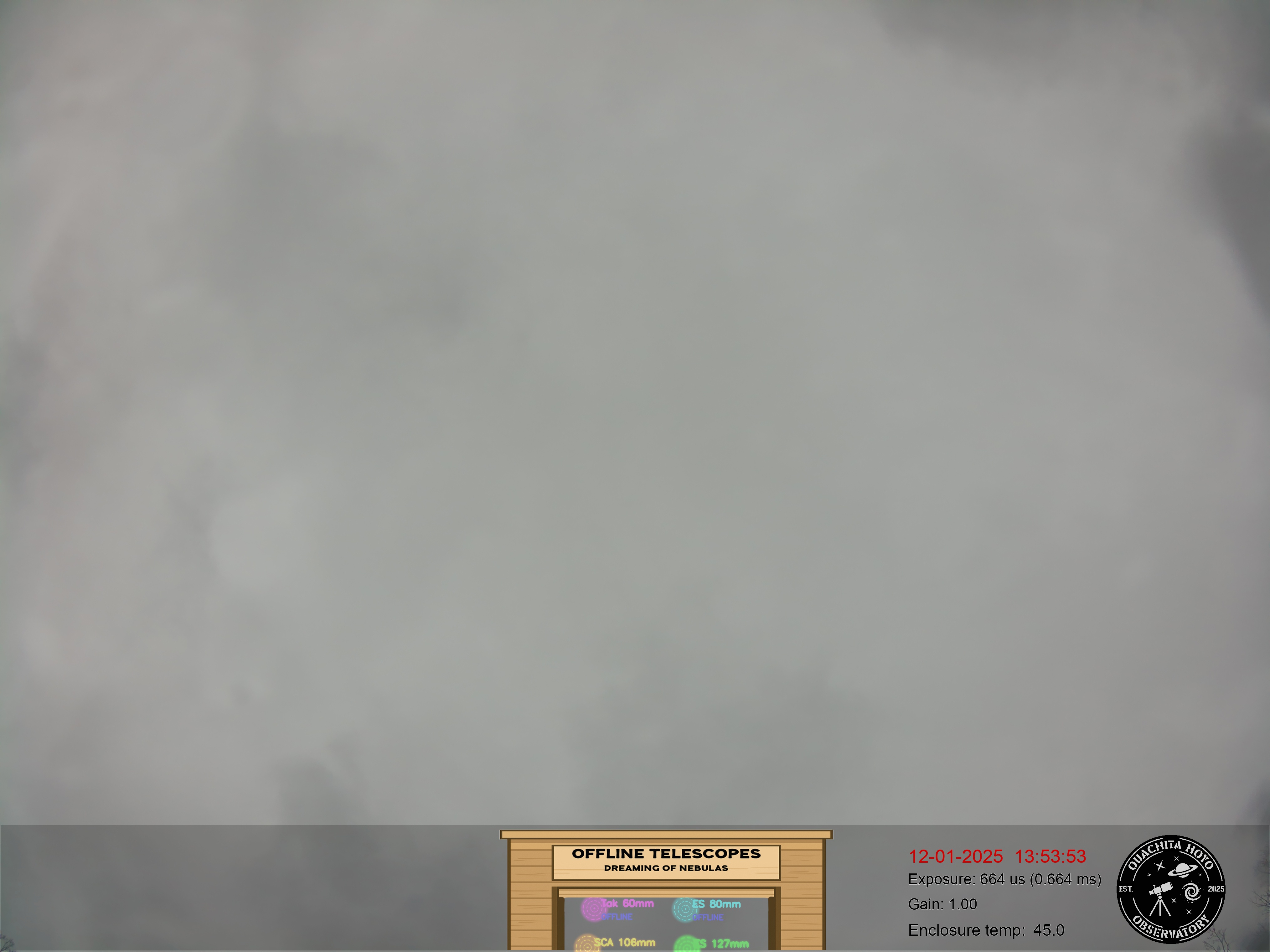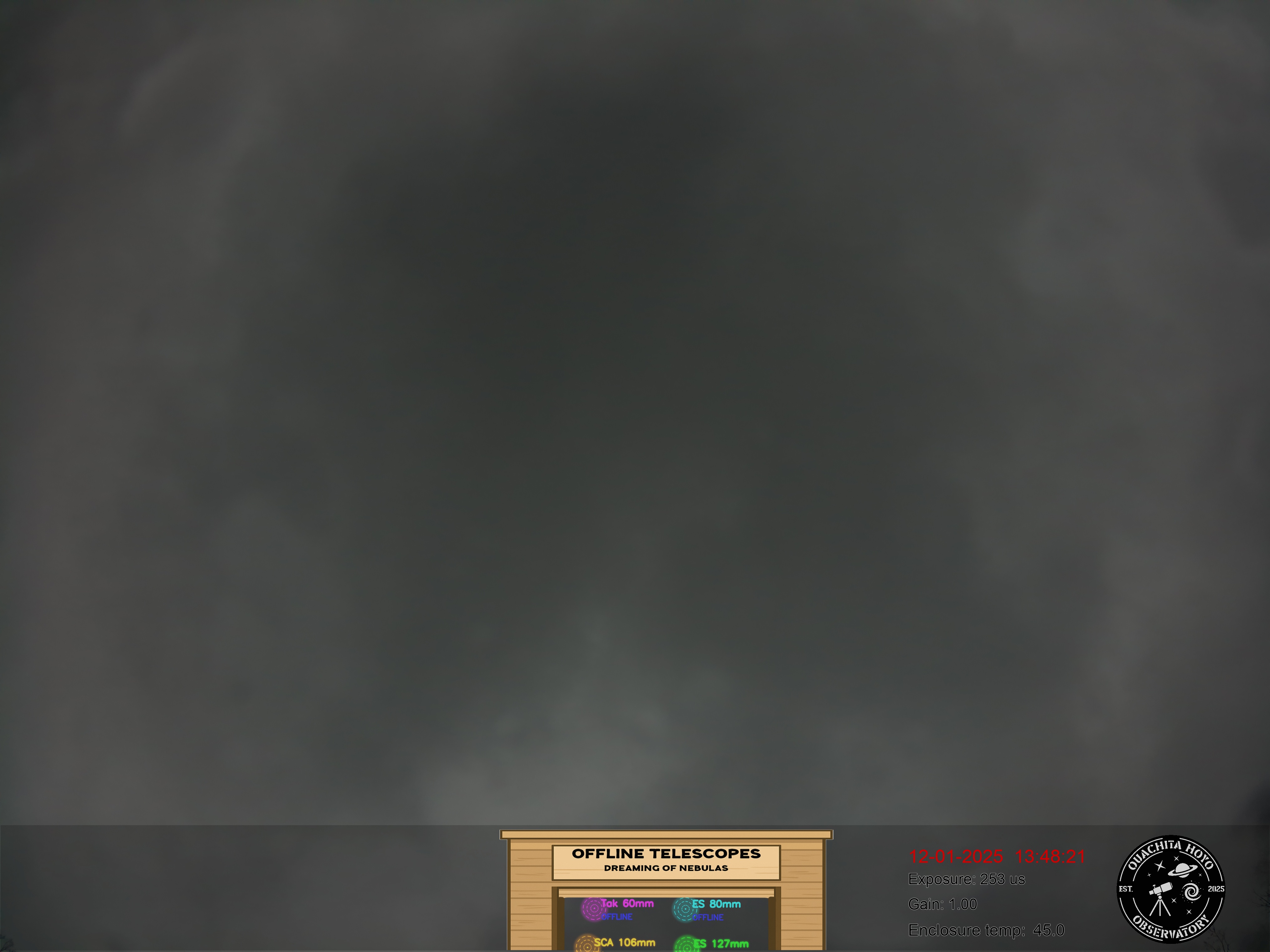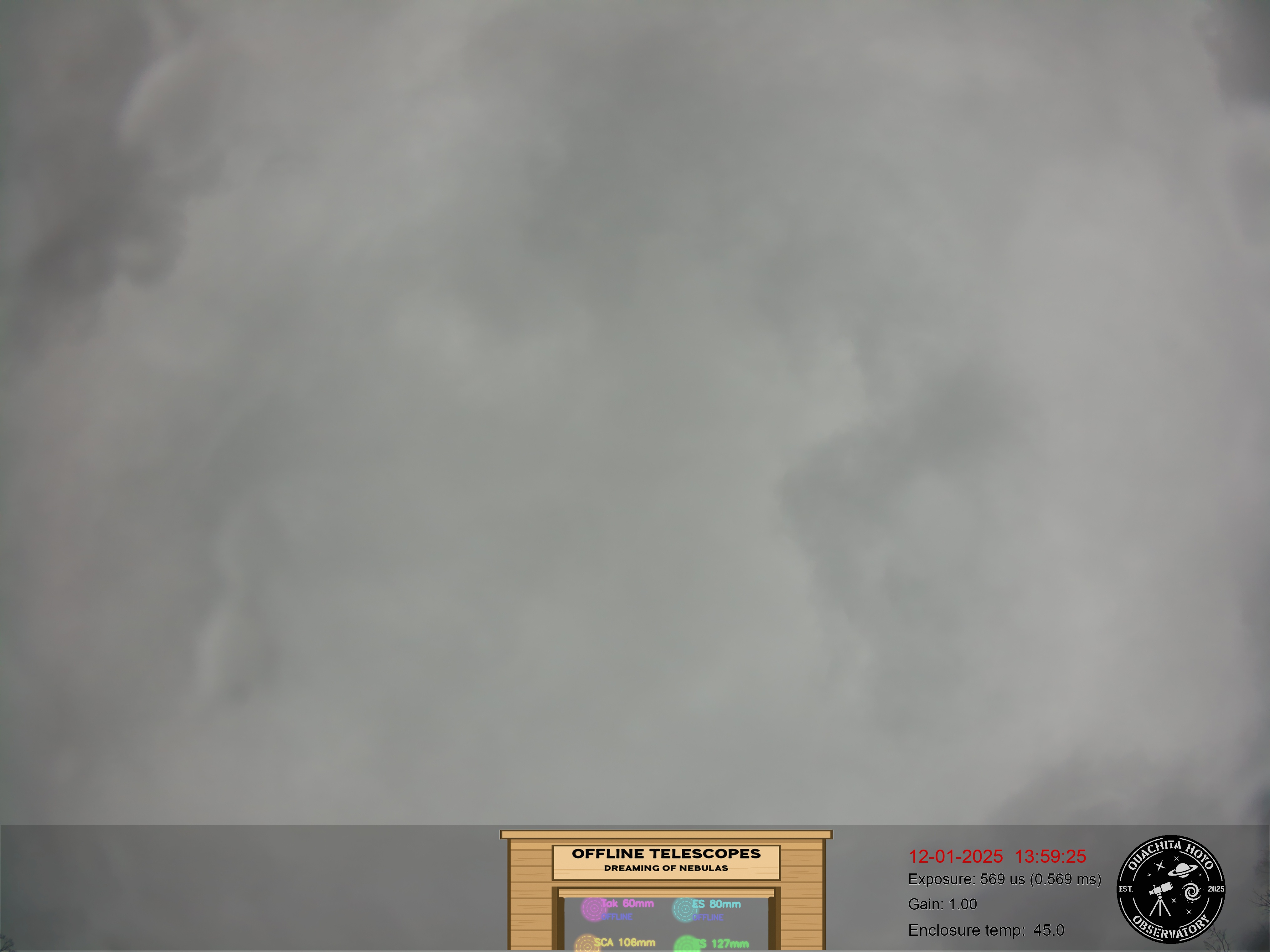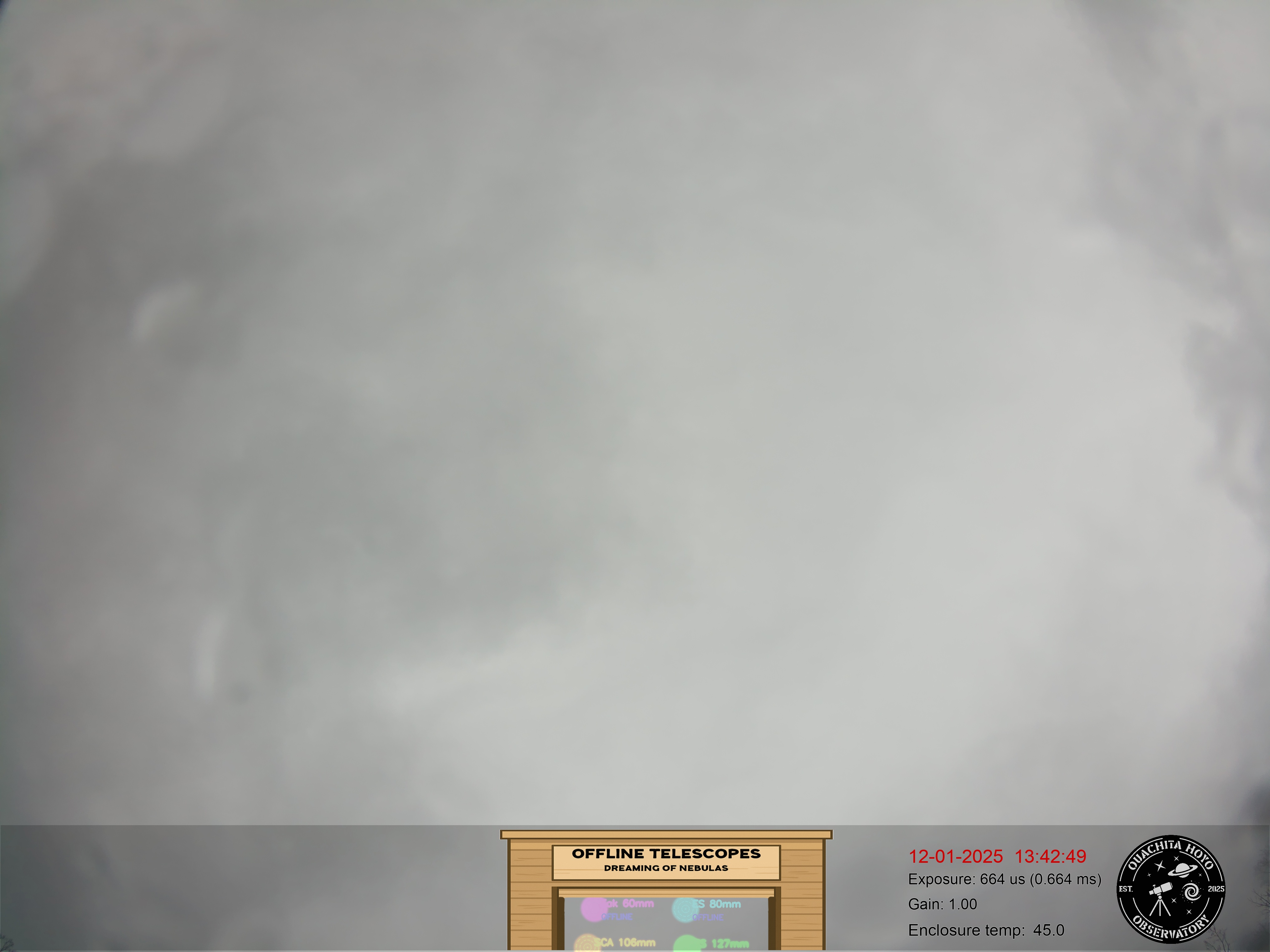 From the roof of my off-grid observatory, this AllSky camera takes continuous images of the night sky—tracking stars, meteors, satellites, skyglow, and weather conditions. The newest image is displayed here automatically so you can see what the sky looks like right now. I also have a build video if you want to see how to make your own Allsky camera – https://youtu.be/4FNSsGdc02w