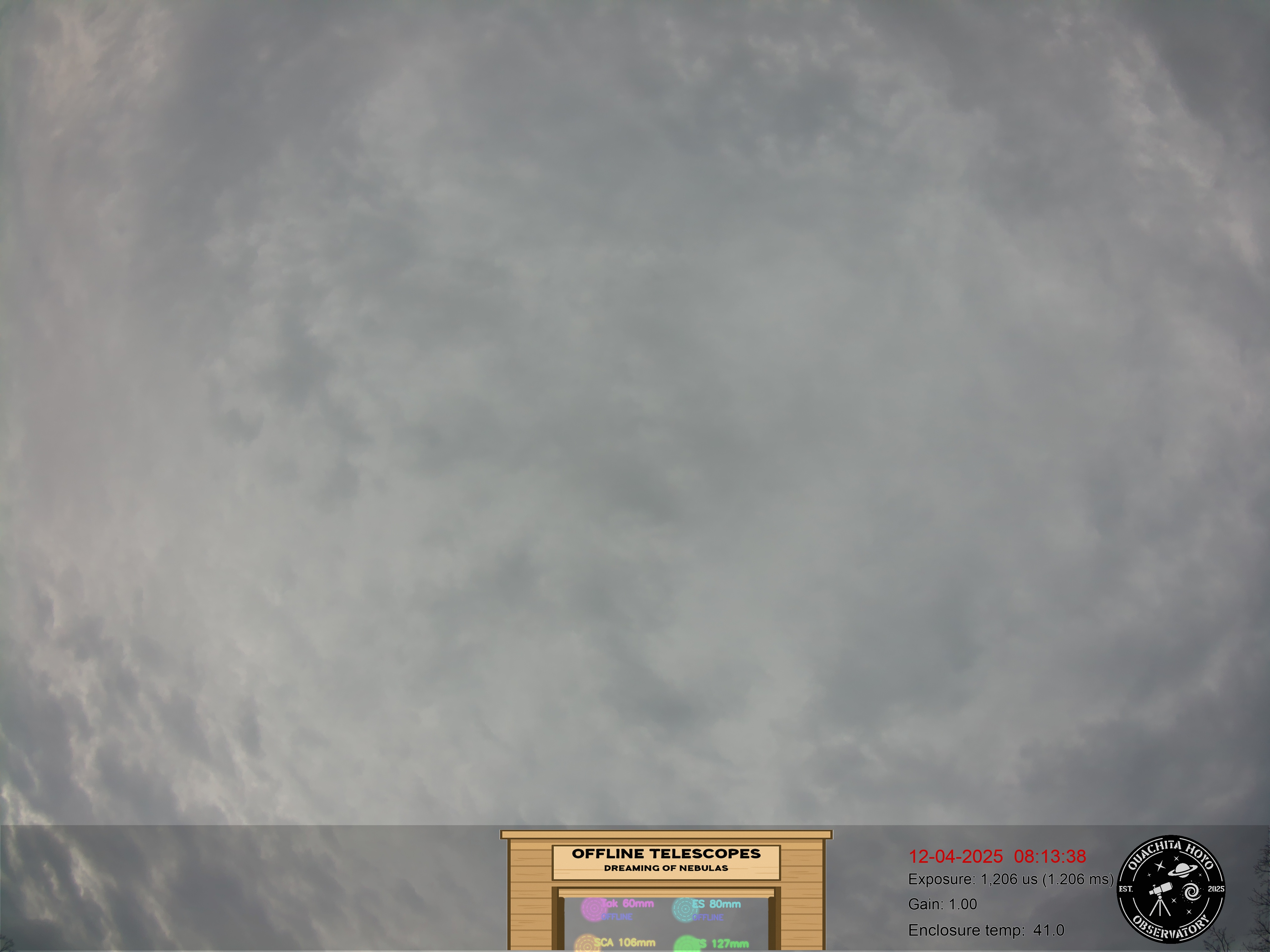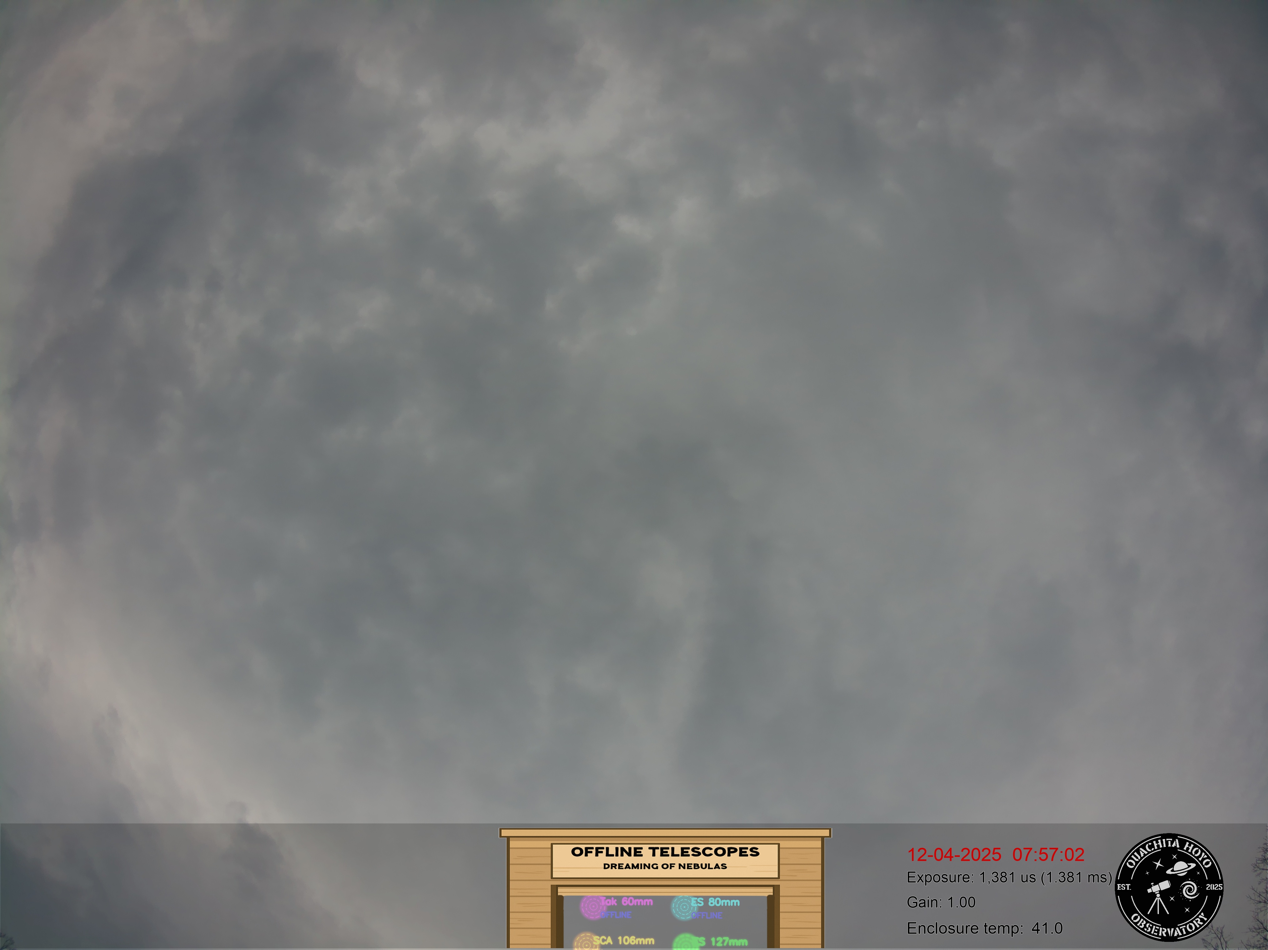 From the roof of my off-grid observatory, this AllSky camera takes continuous images of the night sky—tracking stars, meteors, satellites, skyglow, and weather conditions. The newest image is displayed here automatically so you can see what the sky looks like right now. I also have a build video if you want to see how to make your own Allsky camera – https://youtu.be/4FNSsGdc02w