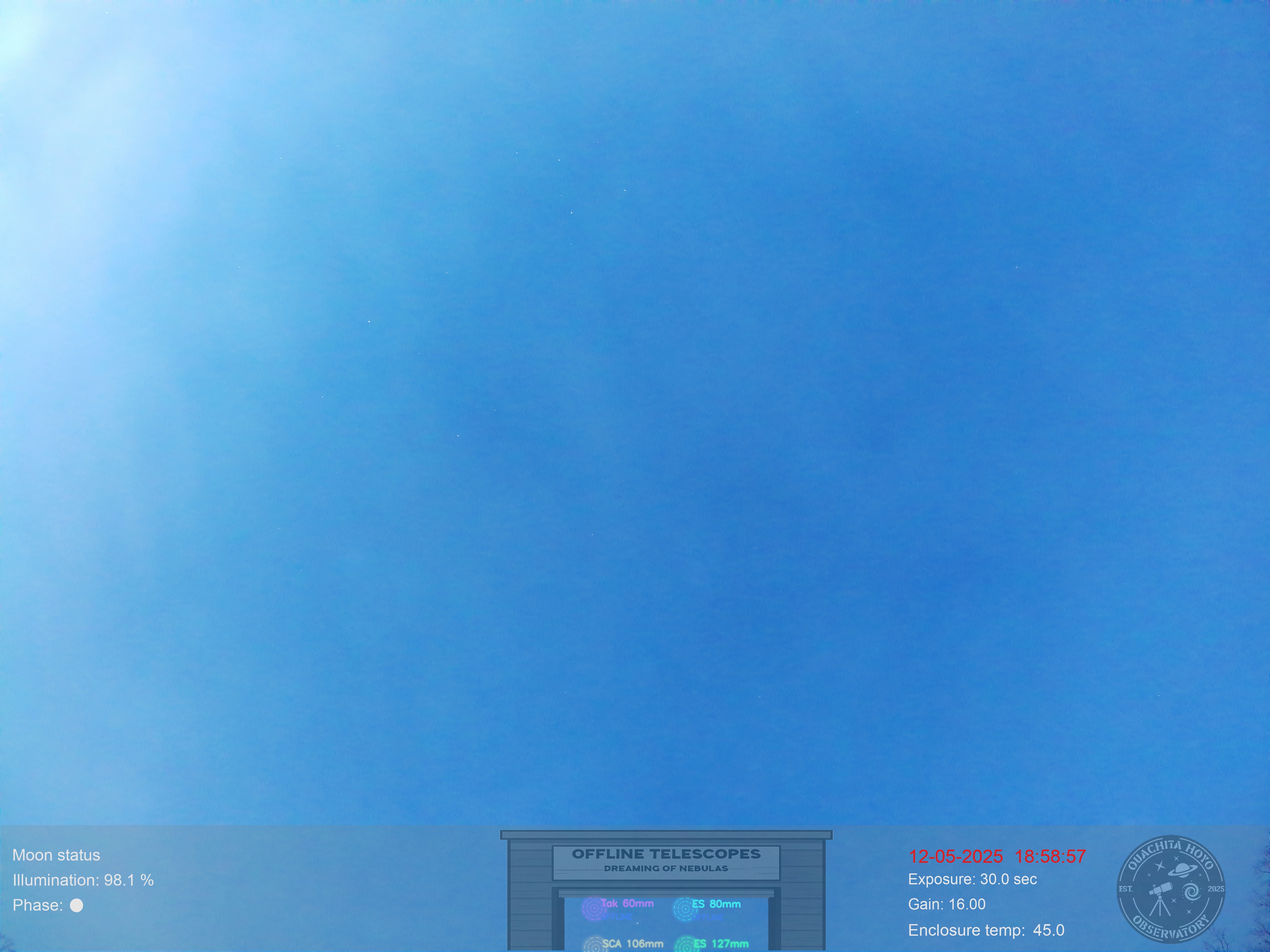 From the roof of my off-grid observatory, this AllSky camera takes continuous images of the night sky—tracking stars, meteors, satellites, skyglow, and weather conditions. The newest image is displayed here automatically so you can see what the sky looks like right now. I also have a build video if you want to see how to make your own Allsky camera – https://youtu.be/4FNSsGdc02w